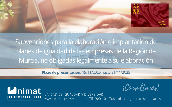 Desde la Unidad de Igualdad y Diversidad de UNIMAT PREVENCIÓN informamos sobre una nueva subvención de interés para las empresas de la Región de Murcia. Se trata de la concesión de subvenciones para la elaboración e implantación de planes de igualdad de las empresas de la Región de Murcia que no estén obligadas por ley a su elaboración.